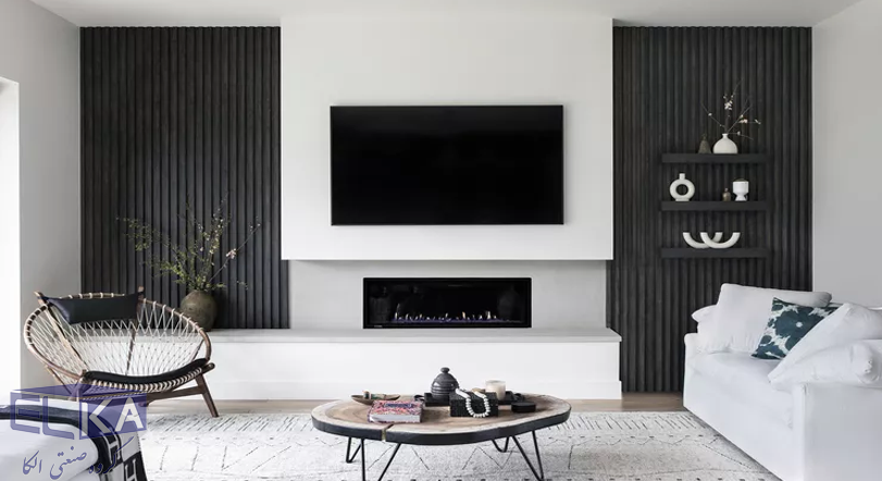مورد بعدی افزودن شیلدهایی است که همسطح تلویزیون و به صورت موازی با آن نصب می شوند. استفاده از روکش تیره برای فضای تی وی وال و ایجاد تضاد رنگ با سایر فضای داخلی اتاق نشیمن چیزی است که ظاهر فضا را جذاب و خواستنی تر می کند.